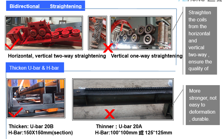 11. BI-retningsrettingsarm er laget av høystyrket legeringsmateriale, høy styrke, slitasje og forbedrer levetiden på slitasje deler, kan horisontal / vertikal toveisjustering av spolene for å sikre kvaliteten på rebarburet.